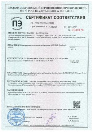 Сертификат соответствия на смолу ионообменную ARTACUT ERS